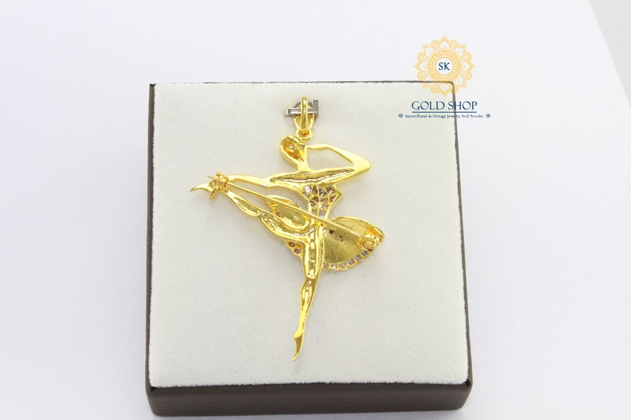 จี้เพชรบัลเล่ต์พร้อมเข็มกลัด ประดับเพชร 32 เม็ด น้ำหนักเพชรรวมโดยประมาณ 0.52 กะรัต ตัวเรือนทองคำ 75% น้ำหนัก 12.2 กรัม (ชั่งทั้งชิ้นงาน) ขนาดหน้าจี้ 4.0×5.0 ซม. (ไม่รวมห่วง) พร้อมเข็มกลัด